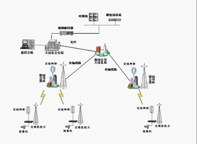 解決上述問題的較好辦法是利用已有無線網(wǎng)橋技術(shù)與盤錦移動網(wǎng)絡(luò)傳輸平臺,通過這個平臺使視頻數(shù)據(jù)信息可以讓大洼縣公安內(nèi)部的各級部門共享,實現(xiàn)對現(xiàn)場圖像的實時監(jiān)視、歷史圖像的回放等功能。