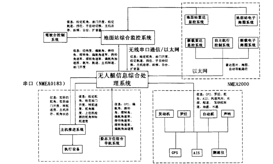 (4)地面站綜合監(jiān)控系統(tǒng)與地面站其他監(jiān)控、導(dǎo)航設(shè)備,通信內(nèi)容包括電子海圖信息、雷達(dá)信息、視頻監(jiān)控信息,以圖片信息為主。包括GPS/北斗、慣導(dǎo)系統(tǒng)、毫米波雷達(dá)、聲納,自動(dòng)駕駛儀,激光雷達(dá),視頻等。其他的使用串口協(xié)議,最后通過RSS232轉(zhuǎn)以太網(wǎng),融合到以太網(wǎng)通信系統(tǒng)當(dāng)中,串口通信簡單快捷,一方面為無人艇信息綜合處理系統(tǒng)提供實(shí)時(shí)的姿態(tài)、方位數(shù)據(jù),另一方面將控制命令傳達(dá)給主機(jī)推進(jìn)系統(tǒng)等執(zhí)行設(shè)備,同時(shí)將從該設(shè)備檢測到的無人艇實(shí)時(shí)運(yùn)動(dòng)狀態(tài)反饋給信息綜合處理系統(tǒng)。數(shù)傳電臺(tái)主要以RS232/485接口為主,從接口以及通信協(xié)議上來講,已經(jīng)不適應(yīng)現(xiàn)代無人艇通信數(shù)據(jù)鏈的要求。