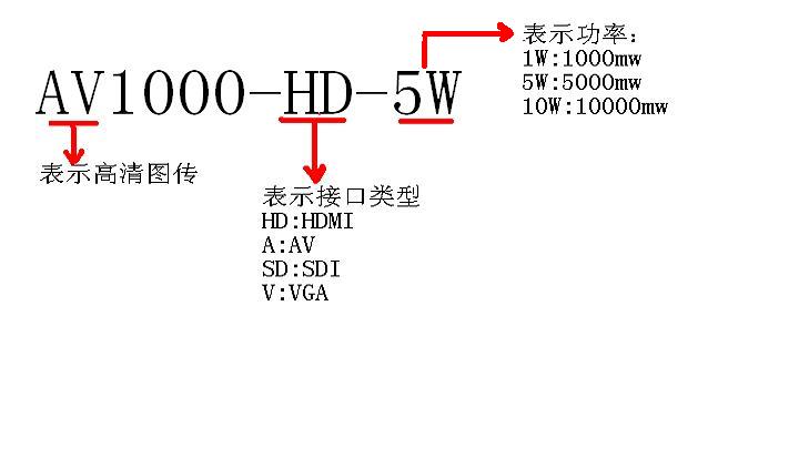 簡介 AV1000-HD命名規(guī)則: HD代表接口形式,如HDMI、AV、SDI、VGA,1W代表發(fā)射功率,如1W、5W、10W。例如AV1000-HD-5W代表HDMI接口,功率為5W的圖傳。-WOT表示定制,用戶可定制多種接口的設(shè)備。