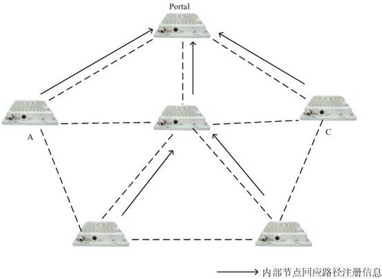 AWM在一經要求的情況下所有路徑被探測到,通過在網絡中不斷發(fā)送路徑信息(PREQ)。目的節(jié)點或者在路徑上的路由器會回復路徑信息(PREP)。注意:如果目標地址屬于一個客戶終端,該節(jié)點會為下面的客戶終端提供代理(例如:答復PREQ以他的名義)。