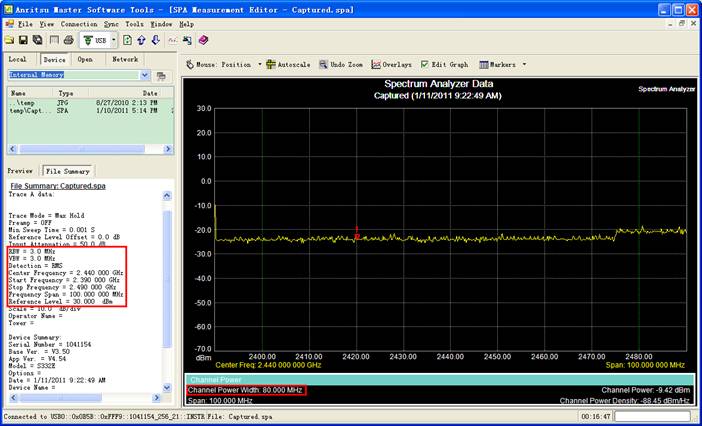 2) 打開S332E頻譜儀預(yù)熱,打開Anritasu Master軟件,并連接到頻譜儀。