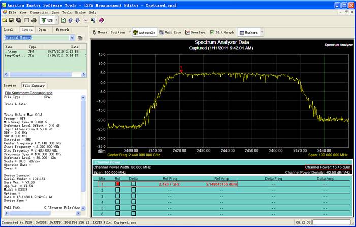 4) 打開無線模塊開始發(fā)射,待波形穩(wěn)定后,即可讀出信道功率。